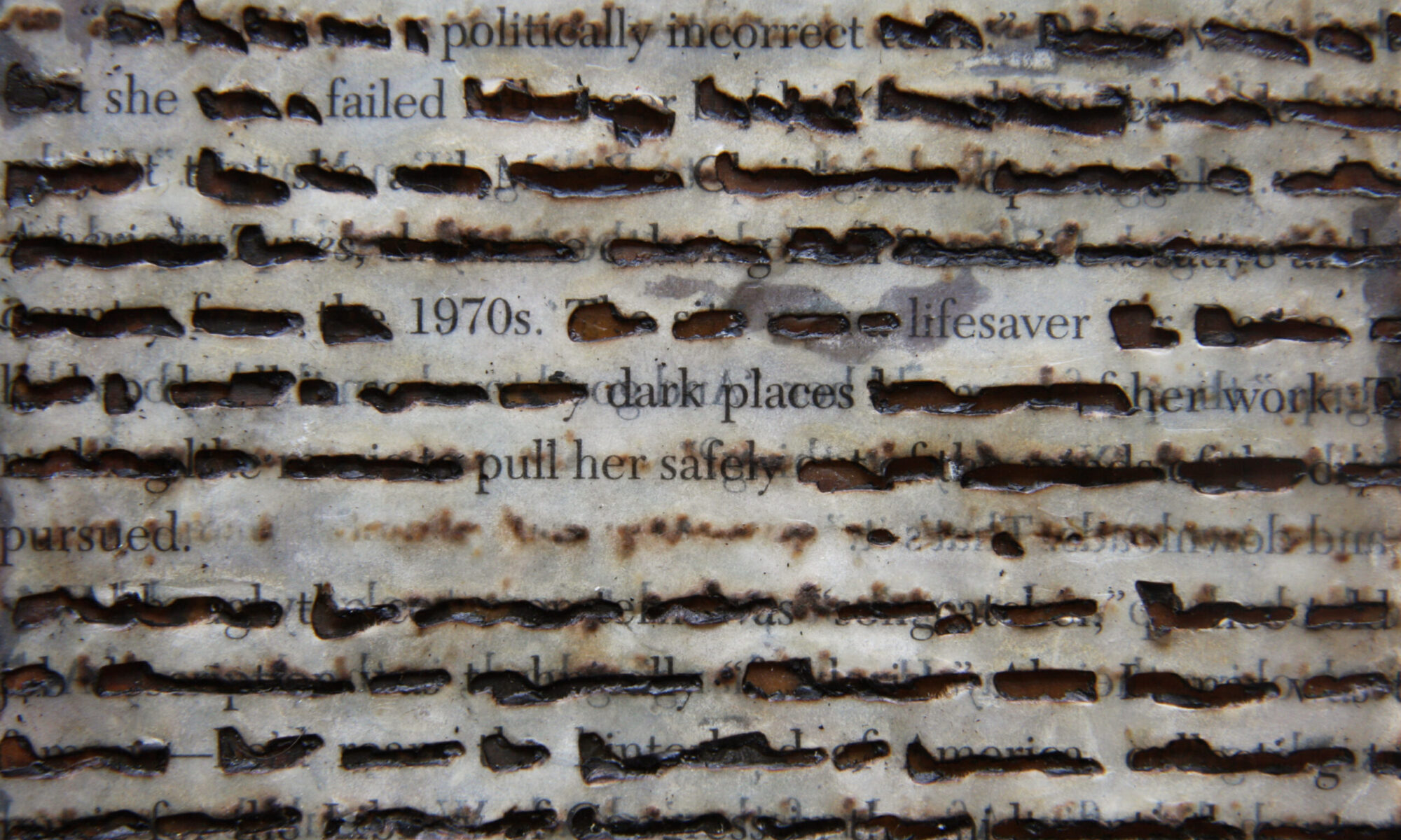 I am a sculptor who disassembles, deconstructs and marries books with found objects and wax and or encaustic to make succinct yet subjective statements about the rights and roles of girls and women in today’s societies. I play with puns, double entendre, symbolism and satire and there are so many metaphors when it comes to books. For example, the work from the Jackets series. The Jacket series references the metaphorical phrase “can’t judge a book by its cover”, as one shouldn’t prejudge the worth or value of something, by its outward appearance alone. The books are humanized by emulating a jacket as an article of clothing complete with fasteners, buttons, ties and other closures. I want to demonstrate that books are important in crafting who we are as individuals.